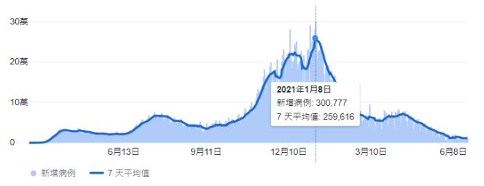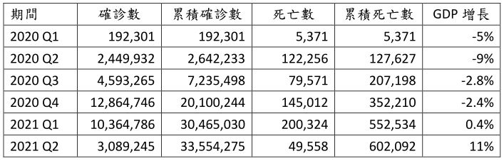 截止2021年6月24日,美國COVID-19確診數約3355萬人,死亡人數超過60萬人,最嚴重的時期應該在第四季及2021年第一季,這兩季美國人確診數都超過1000萬人,而死亡人數在2021年第一季則超過20萬人,而2021年1月8日當天確診數高達30萬人。但疫情對美國經濟衝擊最大的是2020年的第二季,GDP衰退達9%,是大蕭條來最慘的時期,而2021年第一季美國經濟已有0.4%的正成長,第二季則可望有約11%的成長。