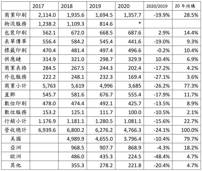COVID-19確實對全球印刷業衝擊很大,2020年當納利歐洲業績減少約48%,其他地區業績減少約20.4%,亞洲影響最小,僅減少約4.3%,美國也減少約10.4%。而就個別商品服務項目分析,外包服務減少約27%最多,而減少超過15%以上有商業印刷、表單及商業表格,除了包裝印刷與標籤是正成長外,其他項目也有約10%的衰退;疫情蔓延期間,確實對所有服務業衝擊最大,包括旅館、餐廳、航空、旅遊場所、商店等,這對一般商業印刷、廣告、資料處理外包服務等會明顯的衰退,但對包裝、標籤的影響不大,反而電子商務的包裝則出現爆發性成長。