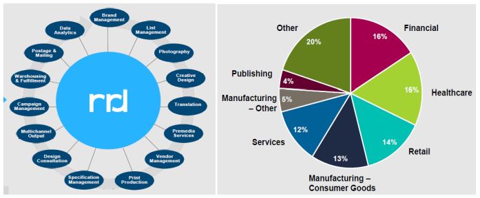 RRD的核心業務是發展客製化多渠道行銷服務(Customized multi-channel marketing services),分行銷解決方案(Marketing Solution)及商業服務(Business Services)兩個事業部來滿足客戶需求,相關的商品、解決方案及服務是很完整的,而客戶結構含71%全球1000大公司,且涵蓋到各個不同的產業,以現有RRD的資源與實力,針對未來客戶的動態(Dynamics)需求環境,架構未來的發展策略以滿足客戶需求。