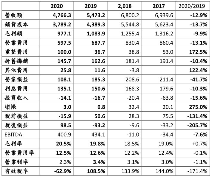 以2020年RRD公告的財務資料,營收額約47.66億美元,毛利額約9.77億美元,較2019年減少約9.9%,毛利率約20.5%,提高約0.7%,這是因為處置低毛利的物流業務;2020年營業費用較2019年減少約9000萬美元(-13.1%),折舊也減少約1700萬美元(-10.4%),但重整費用卻增加6330萬美元(172.5%),致使營業利潤額約1.08億美元,較2019年減少約41.7%,2020年的營業利潤率約2.3%,較2019年減少約1.1%;再扣除利息費用約1.35億美元及其他非營業損益,2020年RRD的稅前損益為-1590萬美元,但稅後損益為9850萬美元,EBITDA約4億美元,較2019年減少約7.6%。