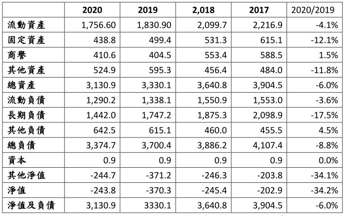表4:2017至2020年RRD 資產負債表 單位:百萬美元