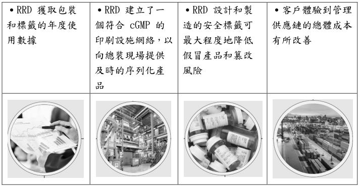 在維持運營和供應鏈的連續性上,RRD啟動強大的供應鏈合作夥伴關係繼續滿足我們全球 30,000家客戶,讓我們在28 個國家及地區保持全面營運。而在有效管理業務績效和經營的流動性措施上,以多樣化的產品和服務組合,滿足不斷變化的需求,創新大流行間的業務解決方案,如對藥廠、醫院、公共場所、工廠等安全措施及引導業務,對包裝客戶則提供更整合性服務,包括設計、紙箱、標籤、說明書、折頁、配件提供、商品組合服務、倉儲管理配送、消費者反饋等服務,來掌握不斷發展中的市場機會,開發新產品服務,如發展全球不接觸業務(Touchless)、醫療組合包、藥廠資料分析與管理、供應鏈客戶的數位資產管理、協助疫苗配送等。