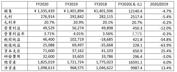 表1:2018至2020年年度大日本印刷經營狀況 單位:百萬日圓/百萬美元