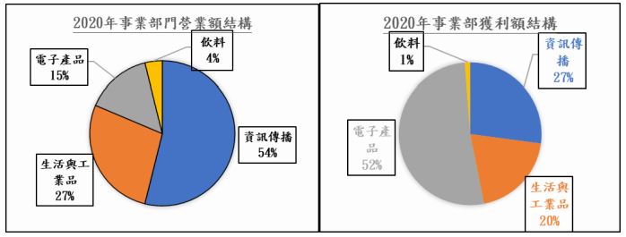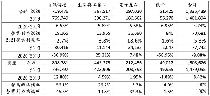 大日本印刷公司現有資訊傳播(Information Communication )、生活與工業用品(Lifestyle and Industrial Supplies)、電子(Electronics)及飲料事業群等四個事業群,2020年,資訊傳播事業群營業額佔54%最大,但營業利益則以電子事業群佔52%最大,飲料事業群不論營業額或營業利益都是最小的部門;比較2019年,電子部門成長約5.58%,其營業利益也成長約7.48%,這是受益於物聯網、下代通訊(5G)與移動產業(Mobility)的快速發展所影響,而其他三個事業部的營收分別減少約6-7%,導致資訊傳播營業利益減少約37%,飲料部門更大減約59%,但生活與工業品營業利益卻增加約25.31%, 2020年的合併營業利益率約5.3%,較2019年減少約0.2%。