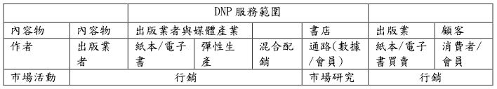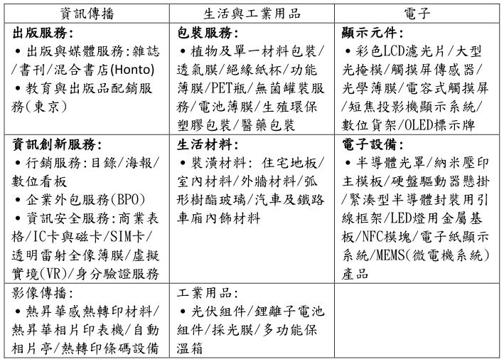 大日本印刷與凸版印刷公司是全球前兩大的綜合性印刷公司,也是世界印刷產業最跨領域服務的領導性企業,其主要競爭優勢是融合印刷和資訊(P&I)技術而發展出的商業模式。1876年,DNP以凸版印刷印書起家,1951年起,進入第二次創業,成為綜合印刷(Comprehensive Printing 1950-1980年)公司,1973年超越美國當納利,成為全球最大的綜合印刷公司,後再跨入資訊處理(Information Processing 1980-2000年)及資訊傳播業服務(Information Communication 1990-2000年),2000年後,以融合印刷與資訊解決方案(P&I Solution)作為21世紀發展的願景,2015年後,更以印刷與資訊的創新(P&I Innovation)來引導未來發展的願景,並確認知識與傳播、生活與移動、食品與健康、環境與能源等四大成長領域為發展目標市場,有關大日本印刷各事業部門的相關產品服務如表3: