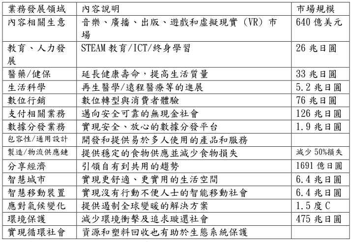 大日本印刷公司將知識與傳播、生活與移動、食品與健康、環境與能源等四大成長領域為長期發展的願景,也對這些領域的細部做市場規模分析,相關的資料如表7。