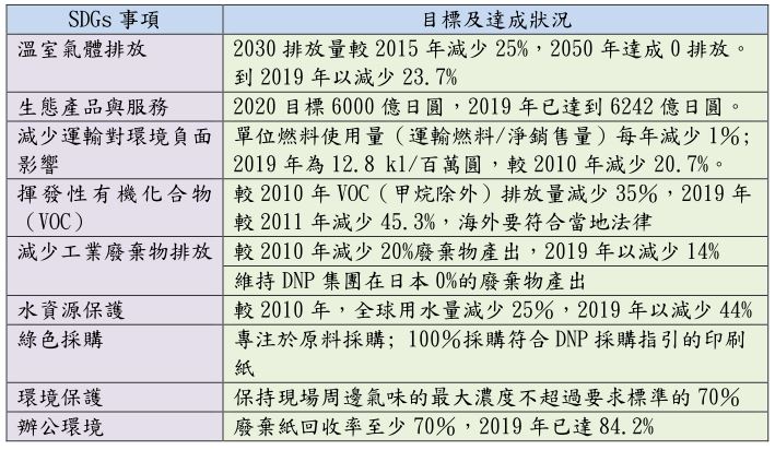 DNP也推動社會責任政策(CSR)到1200家的供應鏈體系公司,連續16年列在Dows Jones可持續發展投資公司名單,連續20年列在FTSE4Good Global Index全球CSR投資公司,連續7年被列入探信息披露(SDP)其最高評級的“A”榜單,DNP的減排、節能等作法是有經過國際科學目標 (SBT) 計劃的批准,在2019年被溫室氣體排放(GHG)非營利組織CDP(總部在倫敦)授予的最高評價。而DNP的可持續發展目標及達成的狀況如表9。
