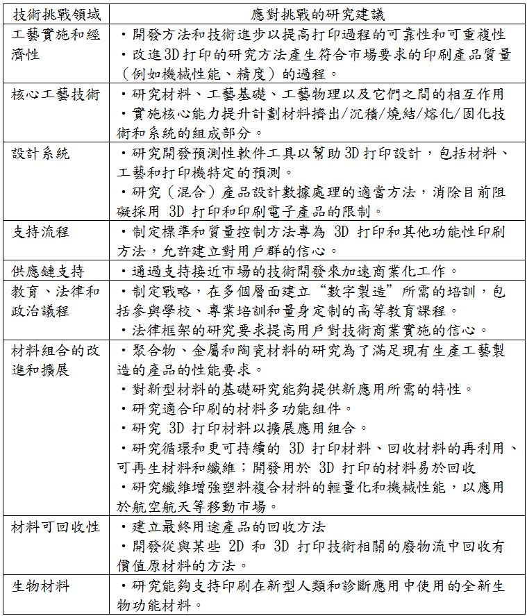就發展數位及積層製造的技術,報告提到工程與製造技術、數字技術、先進材料技術、奈米技術、生命科學技術等是關鍵重點,並以印刷工藝為基礎,發展噴墨印刷機、噴頭與材料等核心組件,整合先進的機電一體化、嵌入式控制和工作流程解決方案的系統平台,可靠性和先進的傳感與控制及智能產業等,而到2025年,需要面對的應用和技術路線圖的挑戰如下: