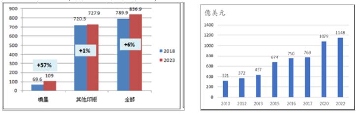 另據InfoTrends資料,2019年數位印刷僅占全球印量的3.1%,但卻占全球印刷產值的16.2%,預估2024年將達全球產值的19.5%(年成長約9.5%),主要成長來自包裝印刷的應用;而2019年市場報告提到,2018至2023年美國數位印刷增長最快的10大市場,分別是瓦楞紙箱(+34.8%)、軟性包裝(+27%)、紙盒印刷(+19.2%)、雜誌(+16%)、目錄(+11.4%)、說明書(+7.7%)、紡織/標牌(6.9%)、標籤(+6.7%)、壁紙/地板及帳單廣告(+6.3%)等;另PIRA談到新領域的工業印刷、功能印刷的年增長率是最高的,2008年工業與功能印刷全球市場規模約200億美元,到2020年約1079億美元,而2022年將達1148億美元,由2010年到2022年均成長率約11%,而這些市場應用於3D印刷、紡織品、廣告行銷、生技醫療、汽車、玻璃、電子、陶瓷、裝飾印刷等項目。
