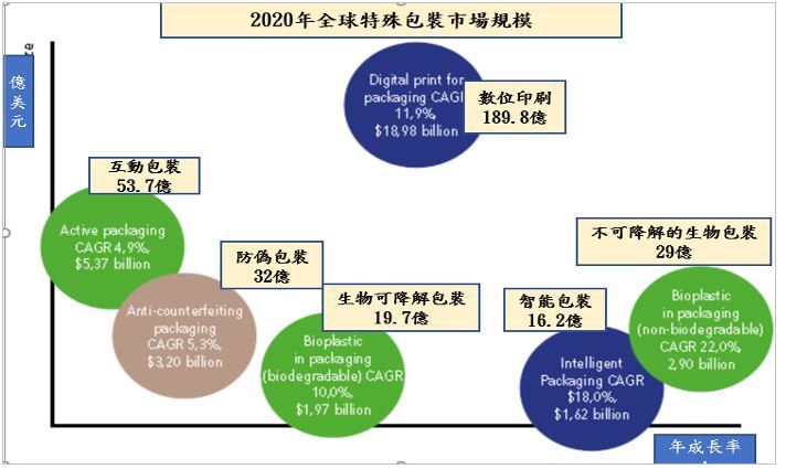 PIRA提供另一值得大家關注的是特殊包裝市場,其全球年增長都高於其他印刷包裝項目,這包括數位印刷包裝的年增率約11.9%,市場規模約190億美元,互動包裝年增率約4.9%,市場規模約3.7億美元,防偽包裝年增率約.3%,市場規模約32億美元,生物可降解包裝年增率約10%,市場規模約1.7億美元,智能包裝年增率約18%,市場規模約16.2億美元,不可降解的生物包裝年增率約22%,市場規模約29億美元。