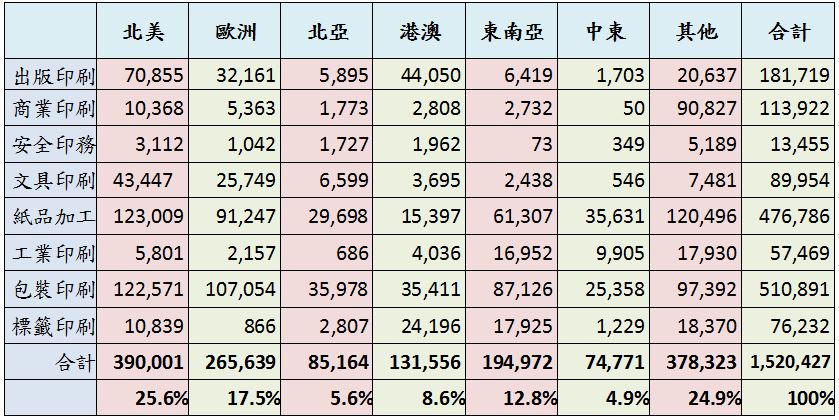 2019年中國印刷品外銷高達152億美元,台灣則僅約8.9億美元,其他香港、星加坡、泰國、韓國、印度等的印刷品出口都比台灣多。而分析中國印刷品外銷市場,北美占約25.6%,歐洲占約17.5%,東南亞占約12.8%,港澳占約8.6%,東北亞占約5.6%,中東占約4.9%,其他區占約24.9%;再分析印刷品品項,包裝印刷品佔約51億美元,約占33.6%,紙品加工約47.6億美元,占約31.3%,出版與商業印刷共約29.6億美元,占約19.4%,文具印刷占約9億美元,標籤印刷占約7.6億美元,其中書籍、兒童畫冊、商業及旅遊印刷品、卡片、標籤、紙製包裝品、筆記本及文具、杯、盤及其他紙製品等,台灣印刷業者都有很大的拓展機會。