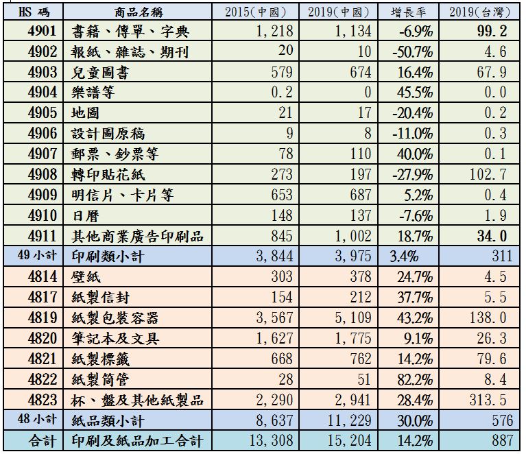 表5:2019年中國、台灣兩地印刷品項外銷統計 單位:百萬美元