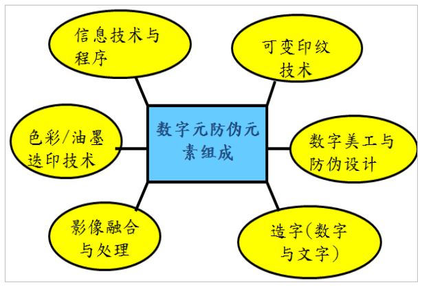 幾乎所有傳統的防偽元素都可以以數位技術來達成,這包括浮雕底紋、隱藏文字、圖案、浮水印、微縮文字、變動隱性螢光流水號、著色纖維絲、變動濾片流水號、凹印效果、文字或影像變化、折光文字圖案、彩虹效果、仿燙金銀效果等,但可變的防偽元素則除了需要數位印刷設備外,還需要資訊技術以資料數理、可變印紋、色彩解譯及資料庫等技術及特定軟體等才可完成,如果要強化防偽作品的複製困難度或凸顯印紋(文字或數位)的唯一性,我們可以透過造字的功能來設計出各種可變印紋,這也是數位防偽技術很重要的觀念。