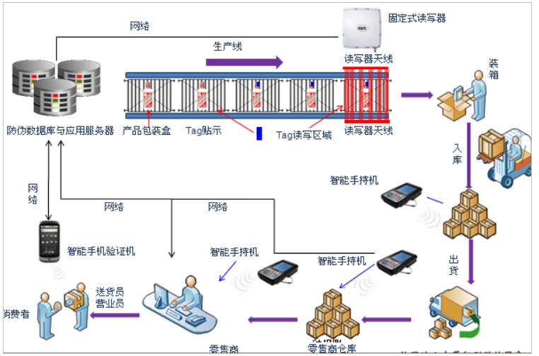 QR碼運作原理(圖3)是手機對準二維碼 → 拍照 → 解碼 → 開啟網頁,使用移動載具(智慧手機及平板電腦),帶動QR碼的行銷與防偽技術的應用將會加快。而使用無線射頻RFID標籤做為物流防偽也將是趨勢,物流防偽RFID標籤可工作於UHF頻段,符合EPC Class1 Gen2 / ISO18000–6c標準,客戶需要資訊與防偽資訊獨立存儲,即滿足防偽要求也適合生產控制、倉儲物流管理。天線部分採用先進電鍍印刷工藝製造,標籤的邊緣部分開易碎口,保證標籤人為破壞後徹底損毀;智慧手機UHF-RFID解決方案可支援android和IOS作業系統,提供低成本UHF-RFID智慧手機讀寫模組和可以直接讀寫UHF-RFID標籤的智慧手機,極大降低了UHF-RFID手持終端的使用成本,使UHF-RFID防偽驗證終端成為可以普及的家用電子設備。