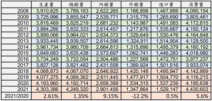 我們再依經濟部製造業產銷統計(表1),2021年台灣紙及紙板產量約430.3萬噸,總銷售量約424.9萬噸,出口量約134.8萬噸,進口量約152.9萬噸(含紙品加工類),總消費量約443.1萬噸,人年均消費(Per Capita)約189.6公斤,較2020年提高約11.6公斤。產銷、進出口量、消費量都創近13年來的新紀錄,由這些資料我們可以感覺到,台灣的製造業因台商回流、供應鏈由中國轉移至台灣東南亞,除了對台灣經濟成長有幫助外,當然對台灣紙及紙板的消費量也增加了;但台灣造紙業史上最高產銷量是2004年,紙及紙板總生產量最高是480萬噸、總消費量是518萬噸,年人均消費量為229公斤,但隨著輕工業往大陸遷移,整體產銷量下降約百萬噸,年人均消費量都逐步下降約50公斤,比2004年資料,到2021年生產減少約10.3%,紙及紙板總消費量減少約14.5%。