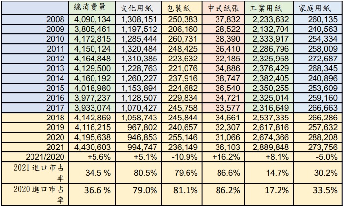 再分析個別產品的消費結構,2021年紙張消費量約154.1萬噸(34.8%),紙板消費量約289萬噸(65.2%),其中2021年的文化用紙的消費量約99.5萬噸,較2020年增加約5.1%,也較2008年減少約23.9%,可看到台灣紙媒體(新聞、出版、廣告等)經營上多麼的艱辛,2020年的出版業就衰退約12%,還好2021年持平沒再衰退;但2021年的包裝紙呈現約10.9%的衰退,而因為新冠肺炎在2021年5月爆發,保持社交距離關閉餐飲、飯店、旅遊區等,讓非居家通路(AFH)的生活用紙幾乎停頓,這占約台灣25%的市場消費關閉約4個月,所以全年的生活用紙消費增長因而減少約5%,但2021年台灣經濟成長達6.1%,全年出口貿易增加29.4%,進口貿易增加33.2%,這都讓紙及紙板的消費增加約5.6%,也接近全年的GDP增長率,而工業用紙的增長率就高達8.1%。