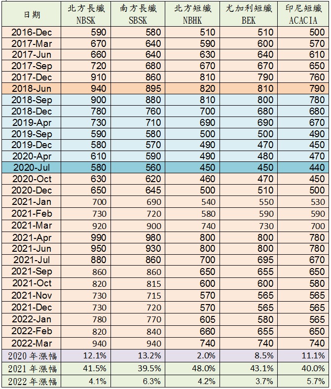表3:2016年底至2022年3月國際漿價統計 (單位:美元/噸)