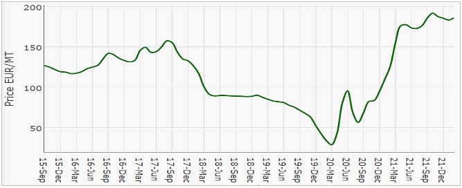 除了漿、木片價格上漲外,廢紙漲幅也是很可觀,依Norexeco平台有關回收紙(OCC 1)過去幾年的價格波動(見表17),2020年3月每噸約28.6歐元,到2021年4月已漲至每噸約176歐元,到10月又漲至每噸191歐元,到2022年2月價格每噸約186歐元;而以台灣海關進口統計,2020年1月廢紙進口均價僅約每噸92美元,到12月進口均價已達167美元(+80%),進入2021年,廢紙仍持續上漲,到2021年12月每噸進口均價達279美元,較元月再漲約67.6%,總共2年內廢紙每噸共漲約185美元(103.1%)。