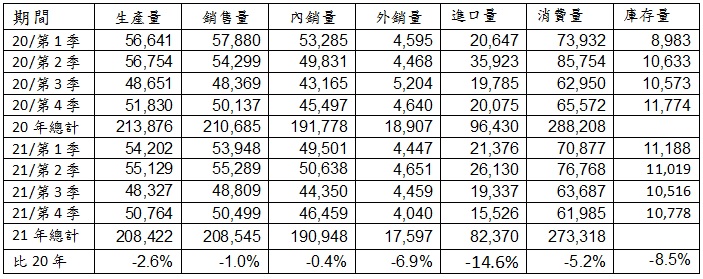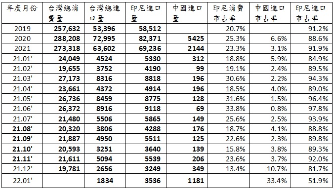 2020年台灣生活用紙總進口量約96,430噸,較2019年的71,651噸增加約34.6%,其中原紙約占82,371噸(85.4%),而由印尼進口更高達72,995噸,占總消費量288,208噸的25.3%;而2021年台灣生活用紙總進口量降至82,370噸,較2020年減少約-14.6%,其中印尼原紙進口量約64,158噸,較2020年減少約13.1%,而印尼進口紙占台灣市場消費量降至23.5%,尤其是2021年第四季,其消費市占率降至17.7%,大大影響整年度市占率。