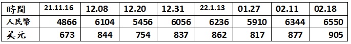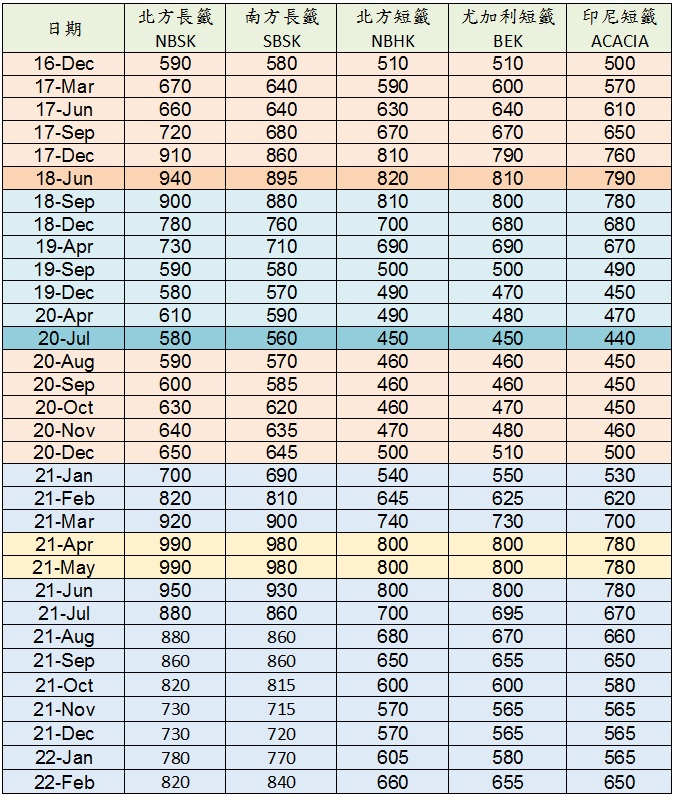 受到能源、物流(海運費)成本上漲影響,加上歐美嚴冬來臨,美國木材期貨價格自2021年11月初又開始回漲,到2022年2月已調高約一倍價格,這當然會影響到製漿木片價格及國際漿價的提升,以過去3個月的上海期貨價格資料,漂白長纖價格在2021年已回跌至每噸4866人民幣(約673美元),12/20日有漲至每噸5456人民幣(約754美元),2022年1/13漲至6236人民幣(約862美元),1/27日又回跌至817美元,但到2/11日則突破每噸900美元,現在則約在880至905美元徘徊。