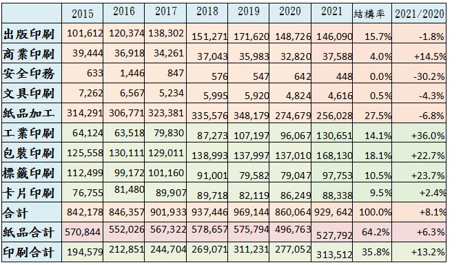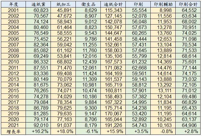 據經濟部工業生產統計資料(表4),2021年台灣漿、紙業總產值約1,912億台幣,較2020年的1650億元增加約15.9%,其中造紙業產值約920億元,增加16.2%,紙加工業約910億元,增加18.0%,衛生產品(紙尿布及衛生棉)為81.8億元,減少約6.1%;另外2021年台灣印刷總產值約649億台幣,較2020年產值631億台幣增加約2.8%,其中印刷業產值約547億台幣,與2020年相比增加約3.5%,但印刷輔助業產值約101.6億台幣,較2020年產值減少0.8%,而以2021年印刷總產值比較2011年產值的771.4億台幣,則衰退約15.8%;再分析2020年印刷業的每季產值,第四季仍是傳統的旺季約占29.5%,其他三季的季節變化不大。