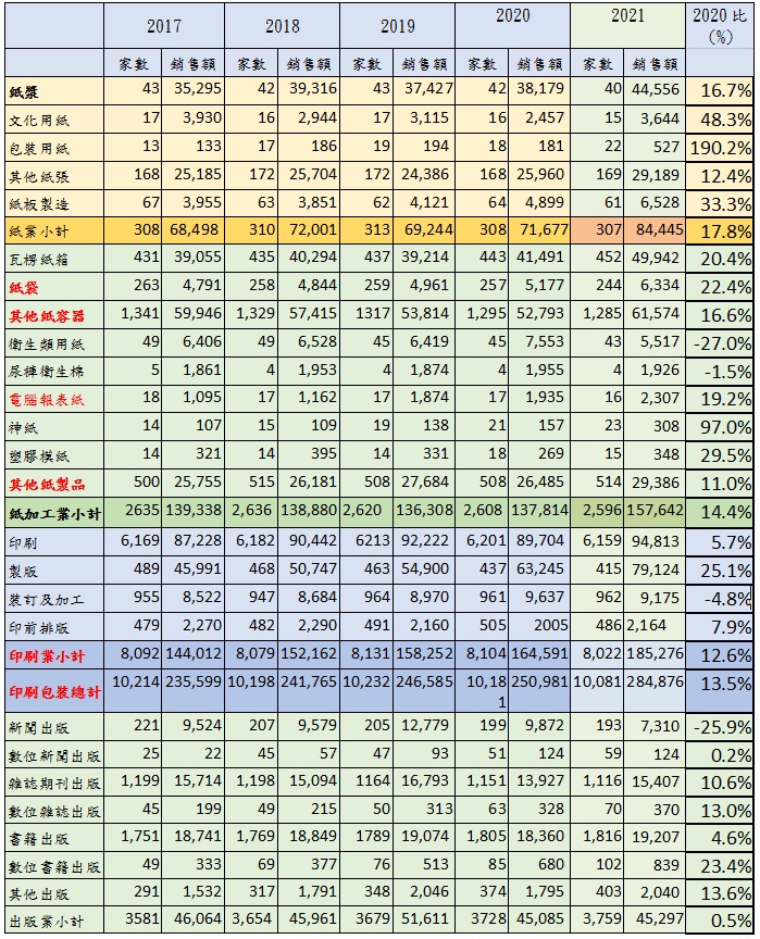 漿價及紙價在2021年大幅飆漲,平均價格估計較2020年漲幅超過15%以上,這也是紙業營業額增長的另一個原因,因疫情讓消費者轉向電子商務,對瓦楞紙箱的需求大增,2021年也成長約20.4%,紙袋也增長約22.4%;而對印刷業來言,紙價上漲對2021年的經營成本大增,雖然營業額約1,853億元,增加約12.6%,但每家的經營壓力是在的,比起經濟部工業生產統計的649億元及增長2.8%,是有很大的落差。但以財政部營業額資料,整體印刷產業規模應在1853億至2848億台幣之間,而造紙業約在850億台幣左右。