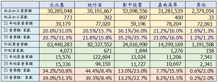 比較兩年資料,2021年紙品加工在中南部營業額佔約57.3%,與2020年的56.2%又提高約1.1%,而2021年印刷業營業額北北基家數占比下降約4.8%,營家數占比下降約0.5%,可見小廠是減少了;而就每家平均年營業額分析,紙品以嘉南高屏最高,每家約7,820萬元,其次為桃竹苗區廠家,每家約7,702萬元,印刷業每家營業額也以桃竹苗區的122,694萬元最高 ,且較2020年每家營業額增加約30%,這跟製版業集中有相當大的關係。