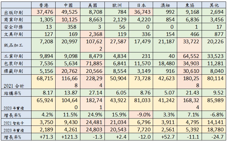 我們再分析2021年台灣印刷品出口地區(見表8),不含智能卡的外銷額,以北美的2.28億美元(佔27.1%)與東協的1.8億美元(佔21.4%)是兩個最大市場,接著是中國約1.17億美元(佔13.9%)、日本約0.74億美元(8.8%)、其他區約0.80億美元(9.5%)、香港約0.69億美元(8.2%)、歐洲約0.51億美元(6.1%)及紐澳約0.43億美元(5.1%)。比較2020年的資料,成長最快的是美國區的24.9%,歐洲區成長約15.9%,中國成長約11.5%,東協成長約7.1%,香港成長約4.2%,紐澳增長約3.3%,但日本則衰退約9%,其他地區衰退約6.8%。