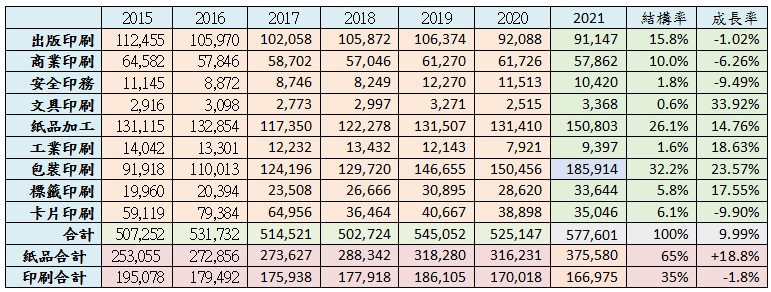 註:印刷包裝業總計項目包括印刷、紙袋、其他紙容器、電腦報表及其他紙製品等項目。