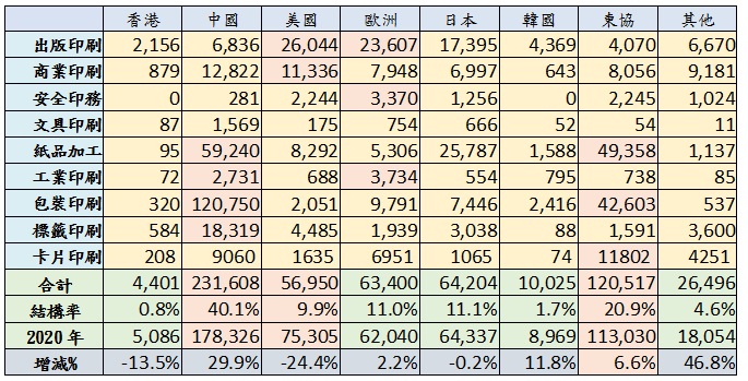 2021年紙品加工(48類)外銷額約5.28億美元(+6.3%),市場主要是北美約2.03億美元(+25.7%)、其他地區約0. 41億美元(-24.9%)、東協約1.01億美元(-5.8%),中國及香港合計約6,786萬美元(-1.11%)、歐洲約4,318萬美元(+12.2%)、紐澳也有4,072萬美元(+3.7%),日本約3,239萬美元(+13.5%),這顯示紙品加工的外銷市場地區是多元的;2021年包裝印刷外銷額是1.68億美元(+22.7%)及標籤印刷是9,775萬美元(+23.7%)。