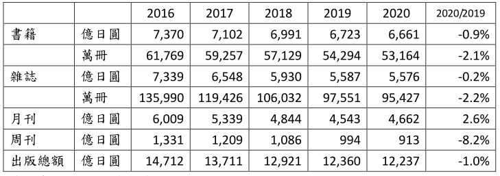 2020年日本的出版行業營業總值約12,237億日圓(表4),較2019年減少約1%,其中書籍營業額約6,661億日圓,較2019年減少約0.9%,雜誌營業額約5,576億日圓,較2019年減少約0.2%,其中月刊營業額約4,662億日圓,較2019年增加約2.6%,周刊營業額約913億日圓,較2019年減少約8.2%。就銷售量來言,2020年日本出版業書籍銷售量約5.3億冊,較2019年減少約2.1%,而2020年雜誌銷售量約9,5億冊,較2019年減少約2.2%¬,疫情對出版業衝擊是不明顯的。