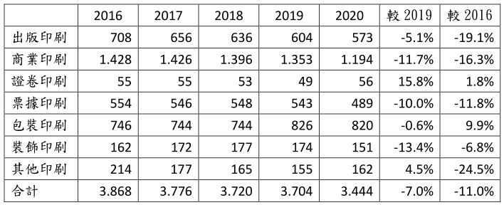 依日本經濟產業省統計日本100人以上員工的印刷企業,2020年營業額約3,444億日圓(表5),較2019年減少約7%,其中商業印刷站約1,194日圓,較2019年減少約11.7%,包裝印刷營業額約820億日圓,較2019年減少0.6%,出版印刷營業額約573億日圓,較2019年減少約5.1%,票據印刷營業額約489億日圓,較2019年減少約10%。但比較2016年資料,出版印刷減少約19.1%,商業印刷減少約16.3%,票據印刷減少約11.8%,但包裝印刷增加約9.9%,整體印刷業在2020年教2016年減少約11%。