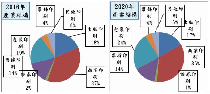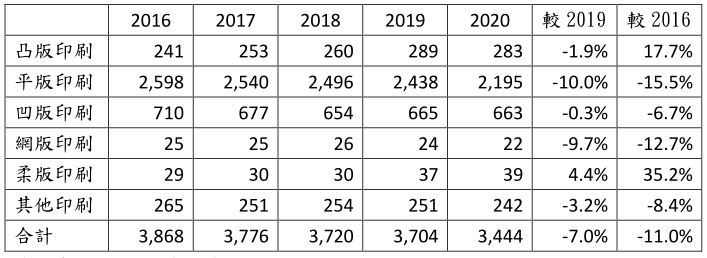 就印刷品項的結構分析(表6),2016年商業印刷占約37%,包裝印刷占約19%,出版印刷占約18%,票據印刷占約14%,但到2020年,商業印刷占比已降至35%,包裝印刷則提高至24%,出版印刷則降至17%,票據印刷持平,這些印刷產業結構性的變化與全球趨勢是一致的,也就是包裝印刷在成長中,商業與出版印刷則持續衰退。