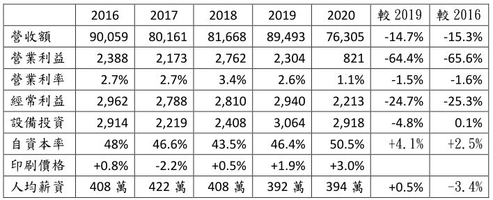 再依日本財務省的法人企業統計資料(類似台灣財政部企業營收統計),2020年日本印刷及相關行業(含印前、印後加工)總營業額約7兆6305億日圓,較2019年減少約14.7%,營業利益約821億日圓,較2019年減少約64.4%,經常利益為2213億日圓,較2019年減少約24.7%。由表8中,看來疫情對日本印刷業的衝擊,營收額減少約1.3兆日圓(14.7%),營業利益減少約1483億(-64.4%),也讓經常利益減少約727億日圓,但2020年印刷行業的整體設備投資,僅較2019年減少約4.8%,而行業的自有資本率反而提高約4.1%。