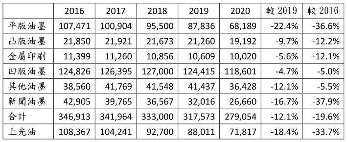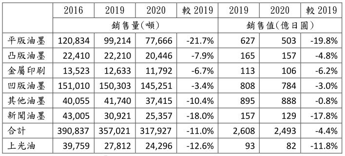 依日本經濟產業省統計,2020年日本油墨產量約279,054萬噸(表9),較2019年減少約12.1%,其中凹版油墨產量最多約118,601噸,較2019年減少約4.7%,減少最多的是平版油墨,2020年產量約68,189噸,較2019年減少約22.4%,凸版油墨產量19,192噸,較2019年減少9.7%,金屬印刷用油墨產量約10,020噸,較2019年減少5.6%,其他油墨產量約36,428噸,較2019年減少約12.1%,新聞印刷油墨產量約26,660噸,減少16.7%,另上光油產量約71,817噸,較2019年減少約18.4%;若比較2016年資料,印刷產業油墨產量降低約19.6%,其中平版墨產量減少約36.6%,新聞印刷油墨產量減少約37.9%,凸版及金屬印刷用墨產量減少約12%,凹版及其他印刷用墨產量減少約5%,上光油產量則減少約33.7%,油墨產量減少也表示各版型印刷量需求的減少。