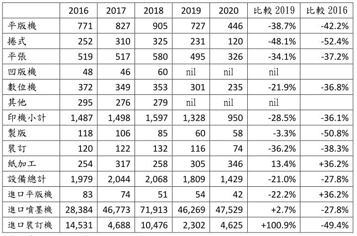2020年日本進口平版印刷機約42台,較2019年少約12台,進口噴墨印刷機約47,529台,比2019年還增加約2.7%,另進口裝訂設備約4,625台,較2019年的2,302台增加一倍;2016年資料顯示,日本進口平版印刷機約83台,噴墨印刷機約28,384台,裝訂積約14,531台,比較2020年的平版印刷機與裝訂機都明顯的減少了。