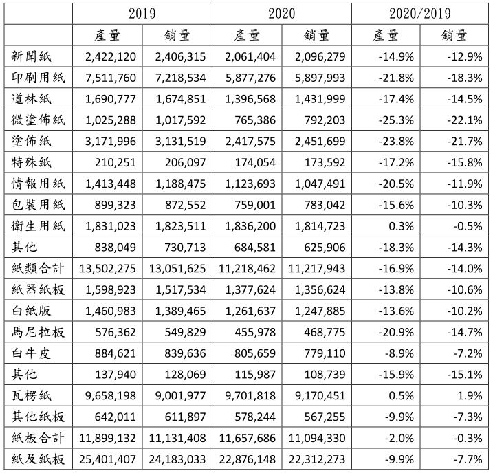 表13:2019及2020年日本造紙業產銷量 單位:噸