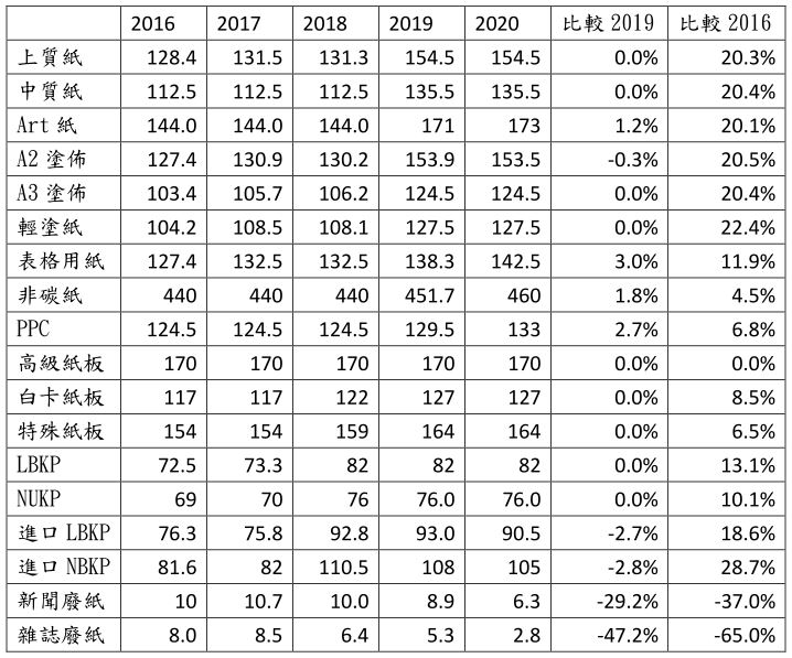 2020年日本紙及紙板的總產值約2兆2,552億日圓,其中紙張產值約1兆4,639億日圓,紙板約791,3億日圓。而日本的紙價除非有原料價大幅波動(至少超過20%以上),否則國內價格不容易有漲跌,即使外銷價格也大都以季來報價,跟歐美紙業價格一般比較穩定,但相對於大陸的紙廠,則會隨著市場景氣及庫存多寡,做急速的調整,2016年至2020年日本的國內紙價行情如表14。